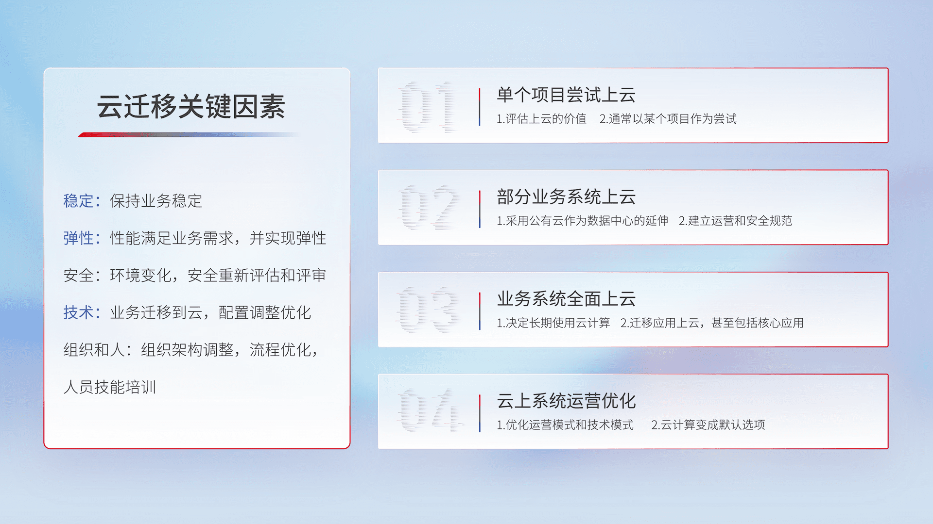 结合实际业务,,,,从规划设计、、云平台选型、、、、云原生改造、、、、数据迁移、、、、集成交付,,迁移全过程为客户识别最佳上云路径,,做好风险识别管理,,,,设计网络架构、、身份权限、、、、安全审计合规、、、、操作审计、、、、日志审计、、、监控告警策略、、、多站点容灾设计等,,对云上基础设施进行整体规划,,,,提升IT治理水平,,以满足弹性、、高可用、、高性能的需求。。