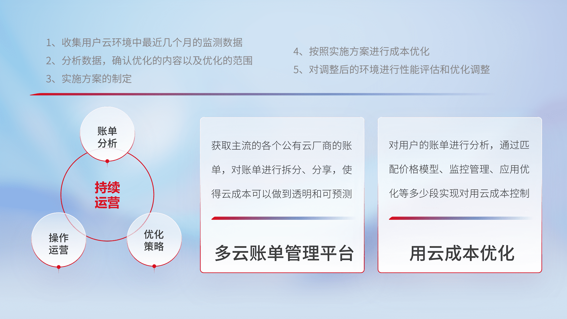 通过多云纳管,,,以统一的资源数据模型把客户的云资源进行抽象和封装,,,进而实现对多云资源的统一操作,,保障云资源管理的可靠性、、稳定性与可用性。。。量身定制化运维内容,,配置、、开发运维、、补丁管理、、、、备份、、、、监控、、、认证和访问管理、、、审计和日常巡检等,,,,保障在用云过程中的可靠度,,稳定度以及高可用率。。